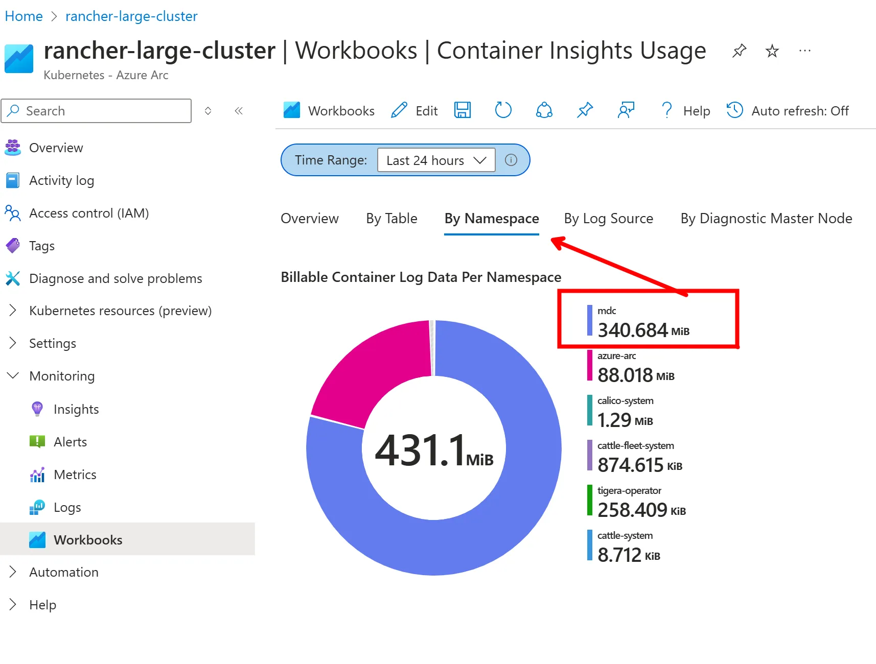To control costs here, the most effective method is by namespace filtering. First, in the Container Insights usage workbook, we can actually get a breakdown of logs ingested per namespace that are feeding into ContainerLogV2. Notice that effectively all the logs are coming from the mdc namespace (which runs the Defender pods) and the azure-arc namespace (which runs the azure arc agents):