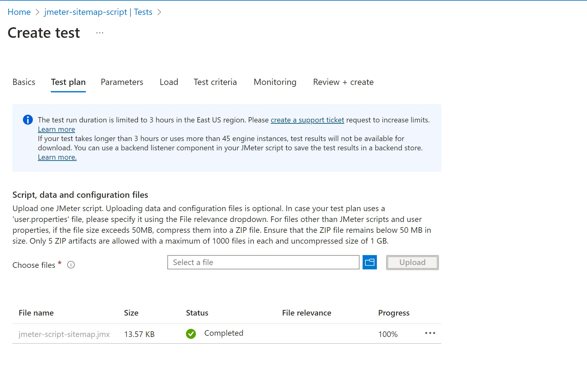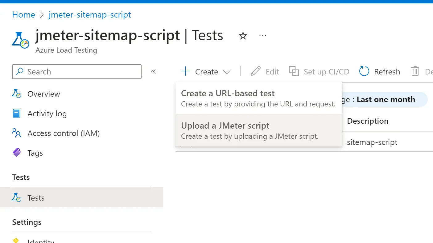 First, create an Azure Load Testing resource and then create a new test by uploading a JMeter script: