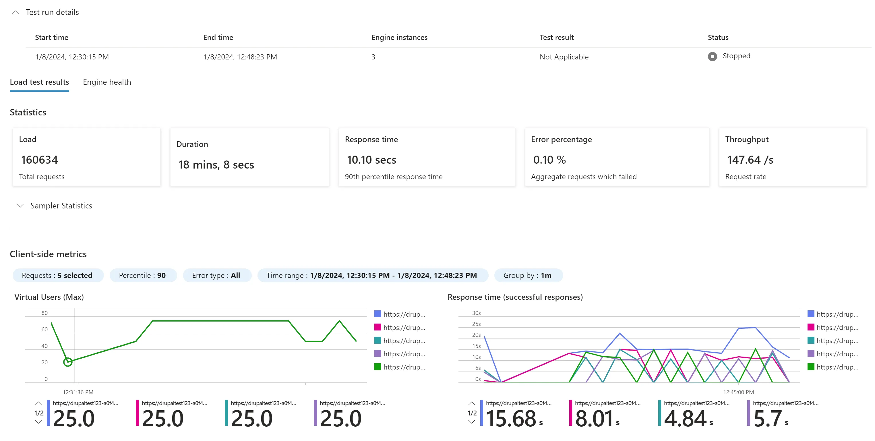 Now that you have the JMeter script and have executed it locally, you can upload it to Azure Load Testing to run a test from the cloud. The benefits include using more execution engines for increased load and also capturing nice results and metrics alonside your Drupal deployment.