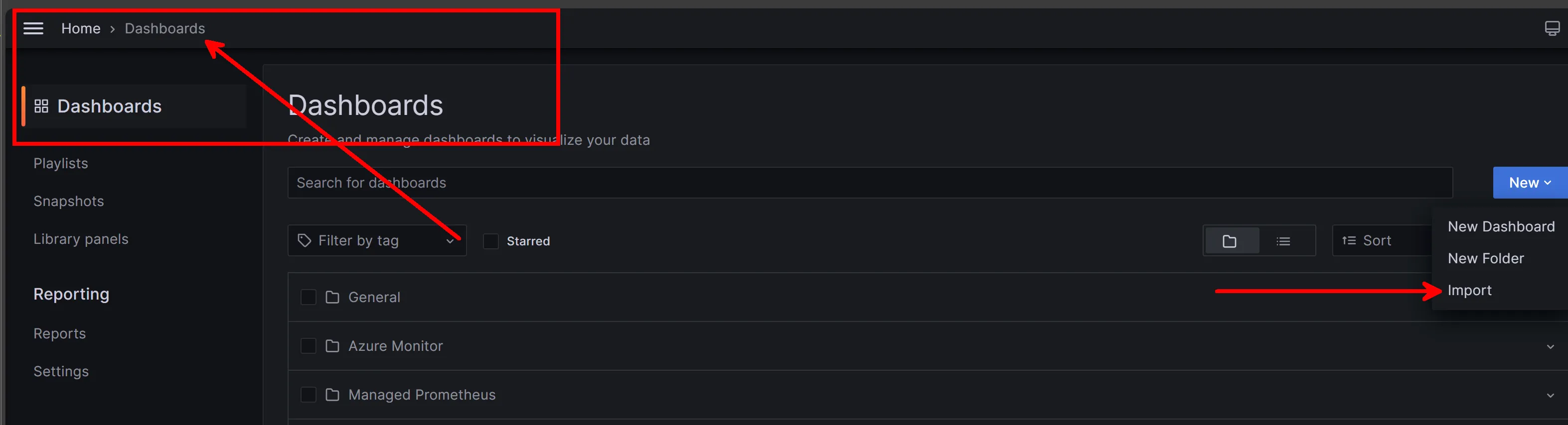 Navigate to Dashboards and select New and Import