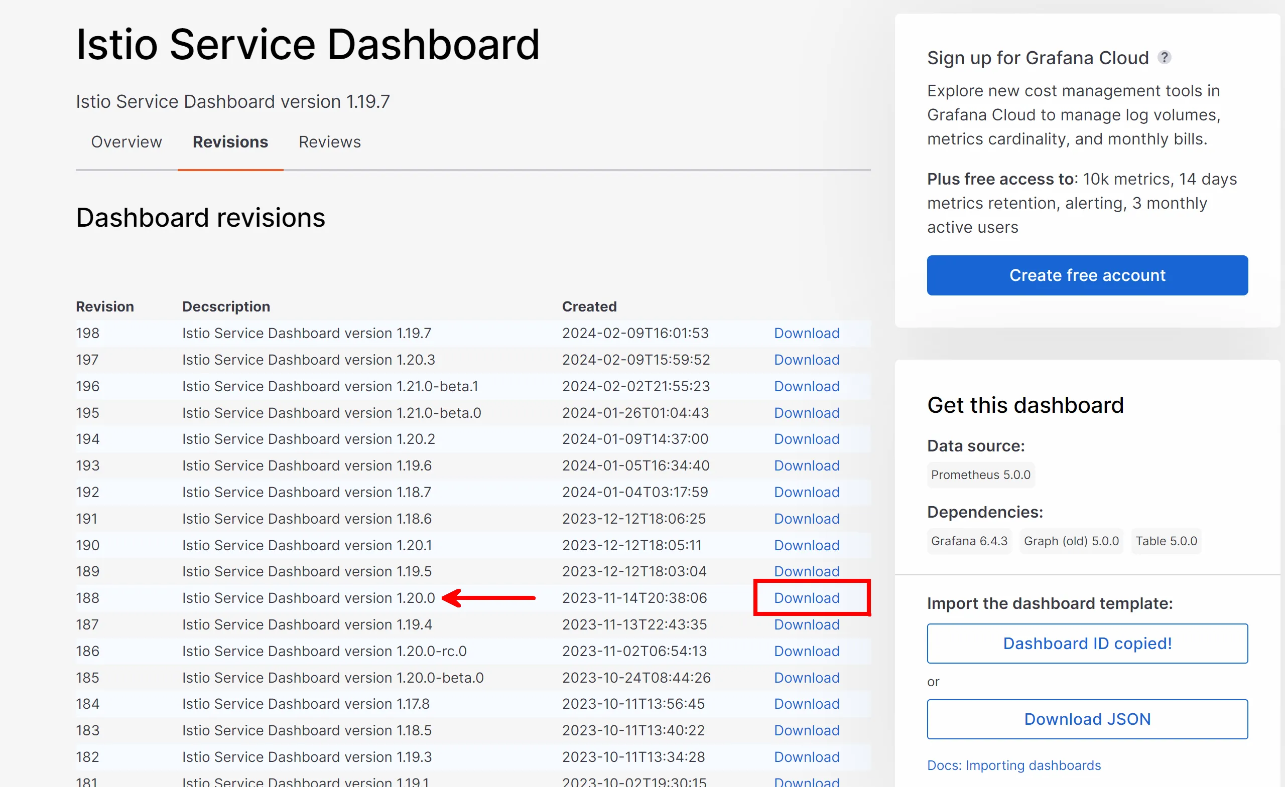I’ll start with the Istio Service Dashboard. We can simply copy the ID to our clipboard and then import the ID in our Grafana instance. Alternatively to correspond to our version, we can select Revisions and download the JSON that matched our Istio Version. I’ll take the second path:
