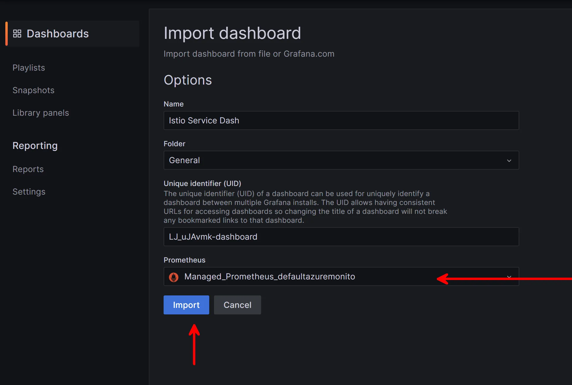 Select your Prometheus Datasource and Import. You can modify the name and folders if desired