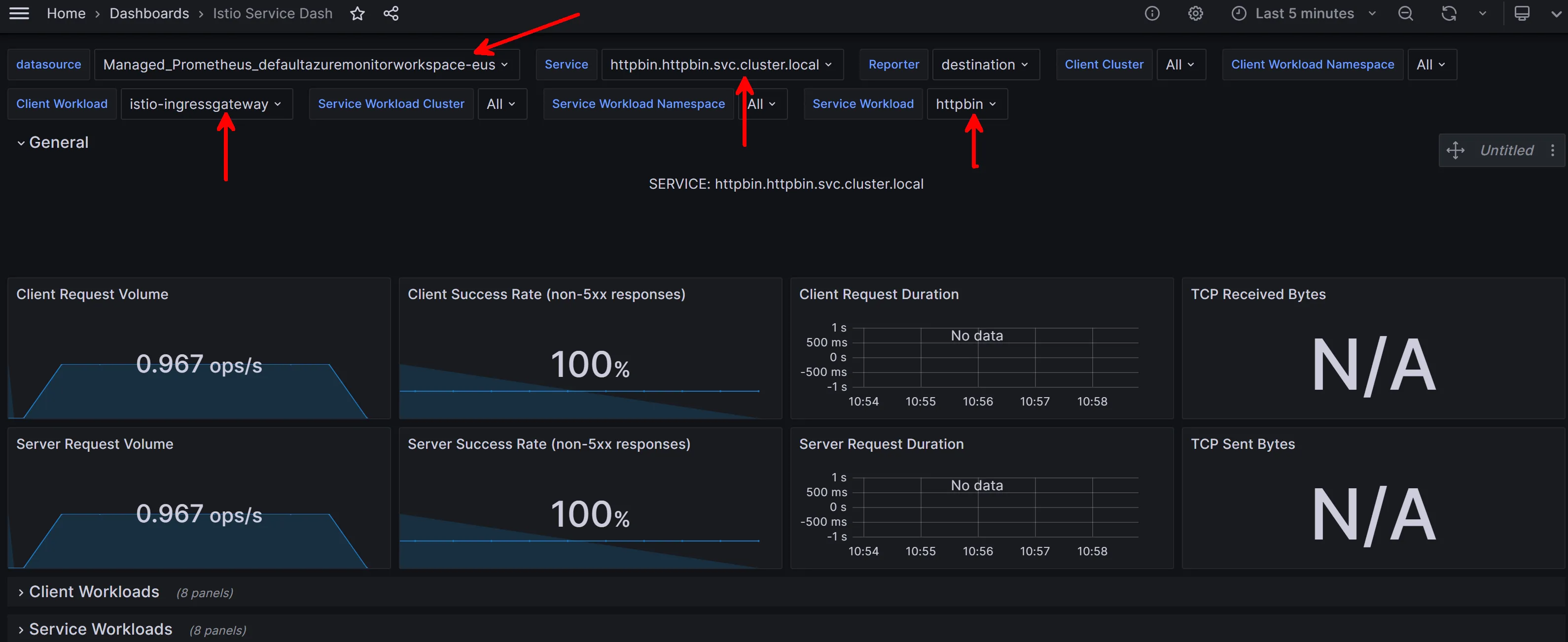 Be Sure to Select your Prometheus Workspace as the data source. You should see istio metrics being populated