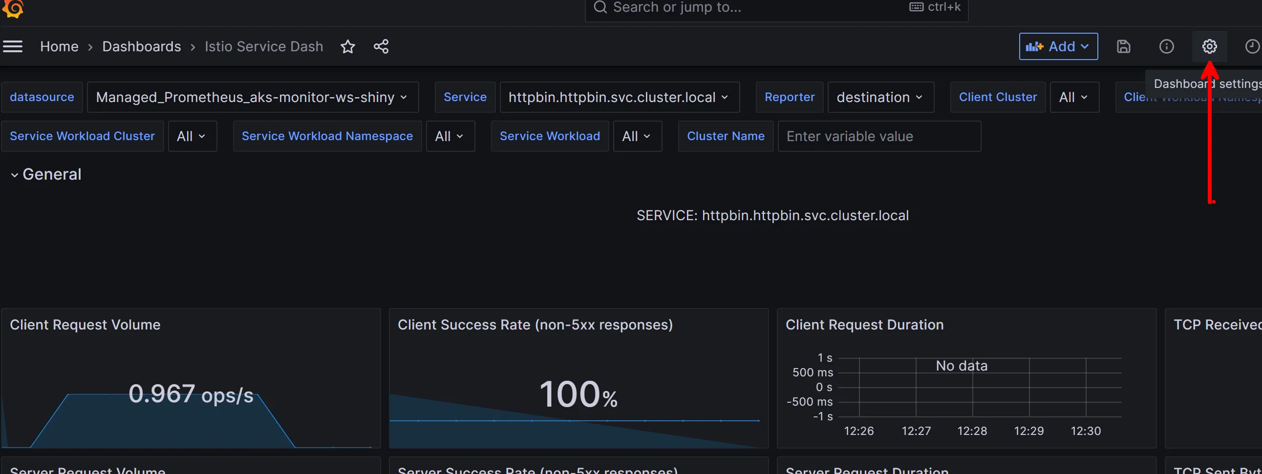 Istio Servicer Dashboard - There is no data for TCP in this case since the gateway is an http gateway