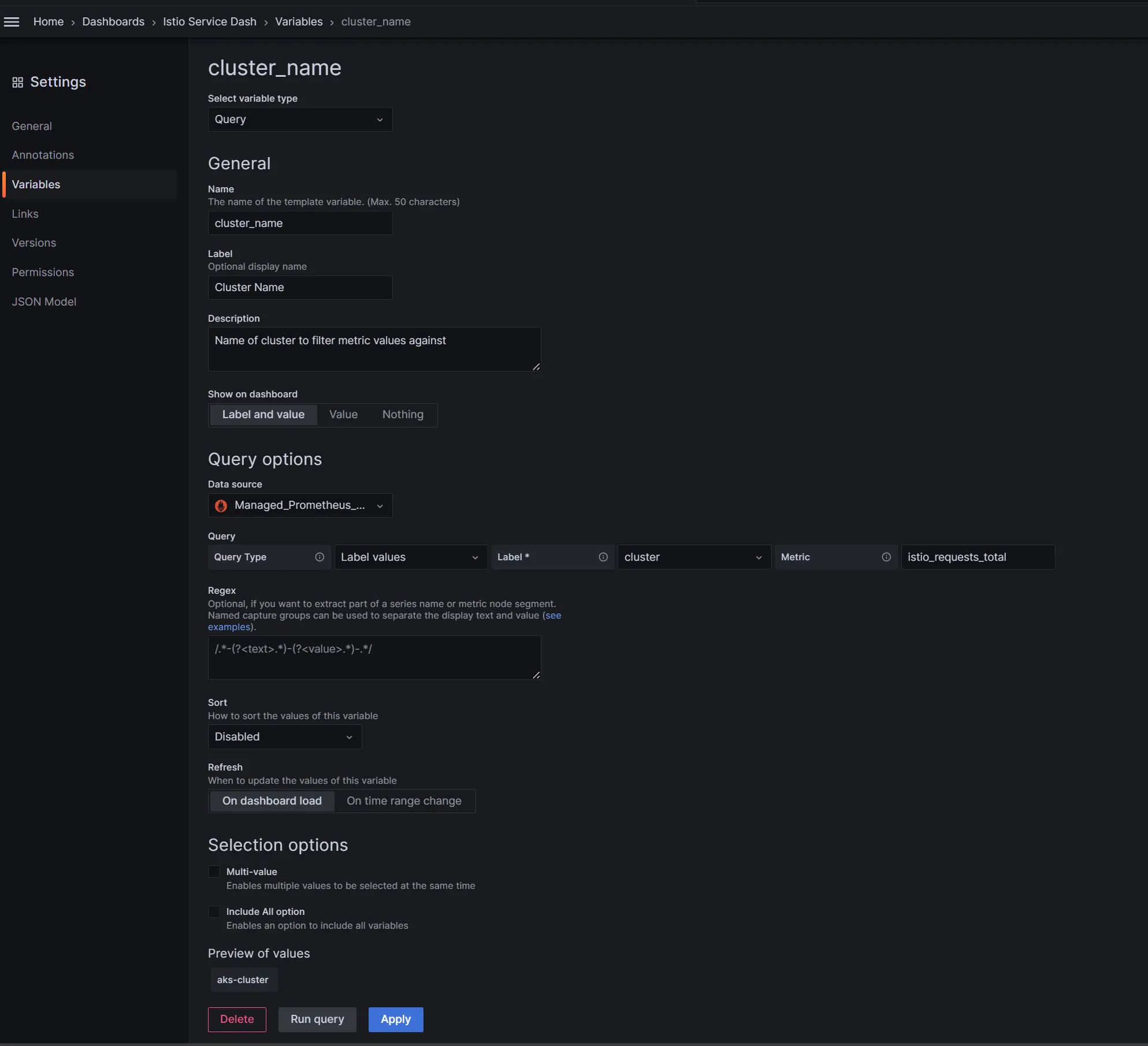Therefore, I could use this label to filter the metrics by each cluster if desired. I would need to add a variable to the dashboard and then use it in the queries. Here’s what that could look like, and again you can customize or do it differently as needed.