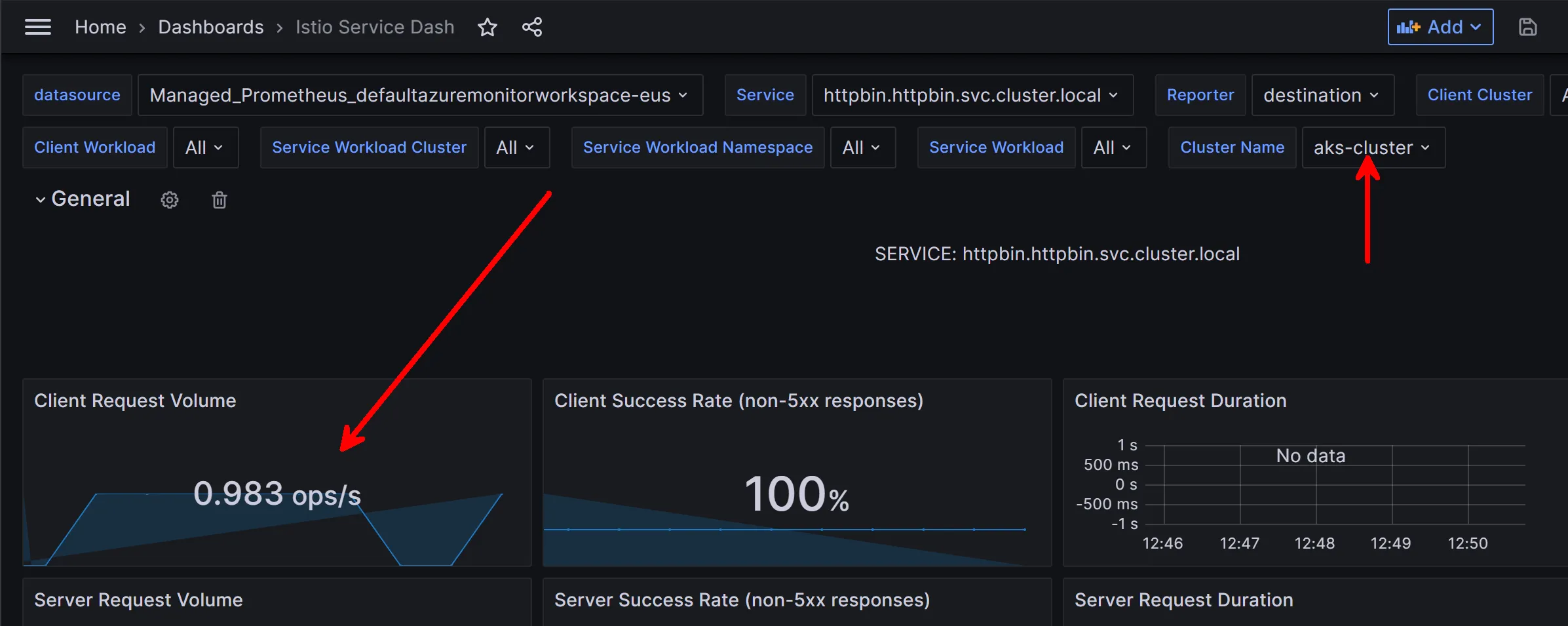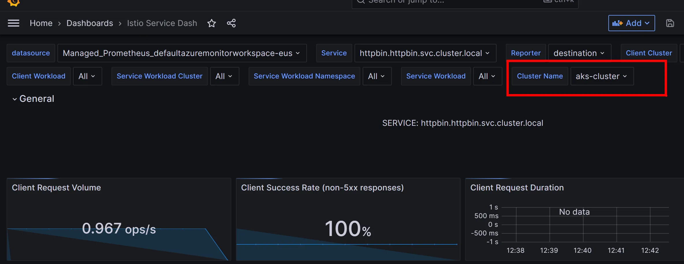 If we consider our example, what would happen if I deployed the exact same httpbin service to another AKS cluster and linked that cluster to the same Azure Monitor Workspace? Basically the results would be double, since the names of the gateway and backend service would exactly match and there isn’t a clear filter on how to say “cluster 1” versus “cluster 2”.