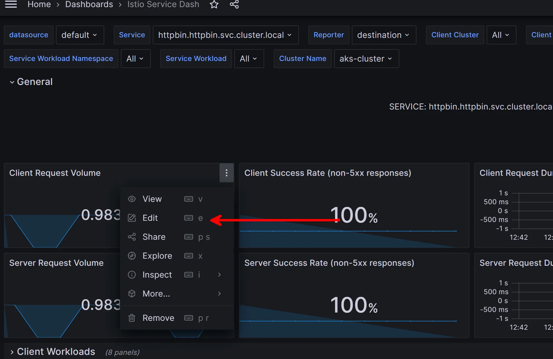 Since I have the curl script running in the background, I am able to see data populated. Notice that the “client” in this dashboard is the ingress gateway and the “service” is the httpbin backend service. The metrics look the same from both perspectives since the gateway forwards everything to the httpbin service in our scenario. The metrics also look accurate since the curl script is generating a curl roughly every second: