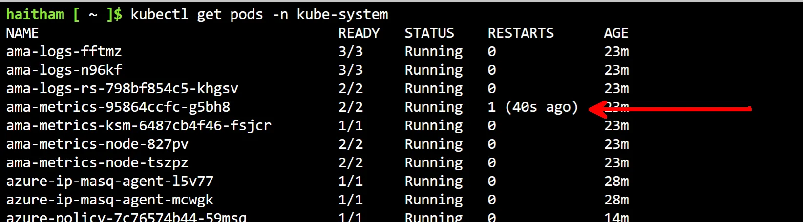 As a confirmation that all is well after you apply the config map, you should find in about 2-3 minutes that the AMA agents in the kube-system namespace have restarted: